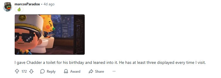 Der Redditor marcosParadox teilt hingegen ein Foto des Maus-Nachbarn Charlie, der sich gerade auf einer Toilette befindet. Er habe ihm einst eine Toilette zum Geburtstag geschenkt und seitdem würde Charlie wohl immer mindestens drei Exemplare bei sich zu Hause ausstellen.