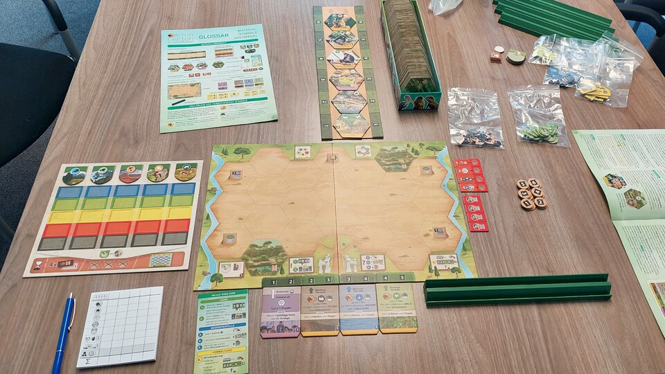 Ähnlich wie bei Dorfromantik muss man die sechseckigen Plättchen klug platzieren, um am Ende möglichst viele Punkte zu bekommen, aber im Solomodus sollte man auch möglichst schnell auf eine der Siegbedingungen arbeiten: Alle Zoofelder vollbauen oder 4 Artenschutzziele erreichen. Die dritte Bedingung, dass man keine Karten mehr im Stapel hat, ist innerhalb der 18 Züge im Solo-Spiel unmöglich zu erreichen.