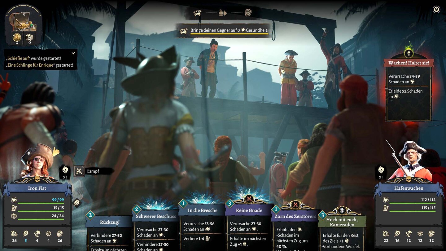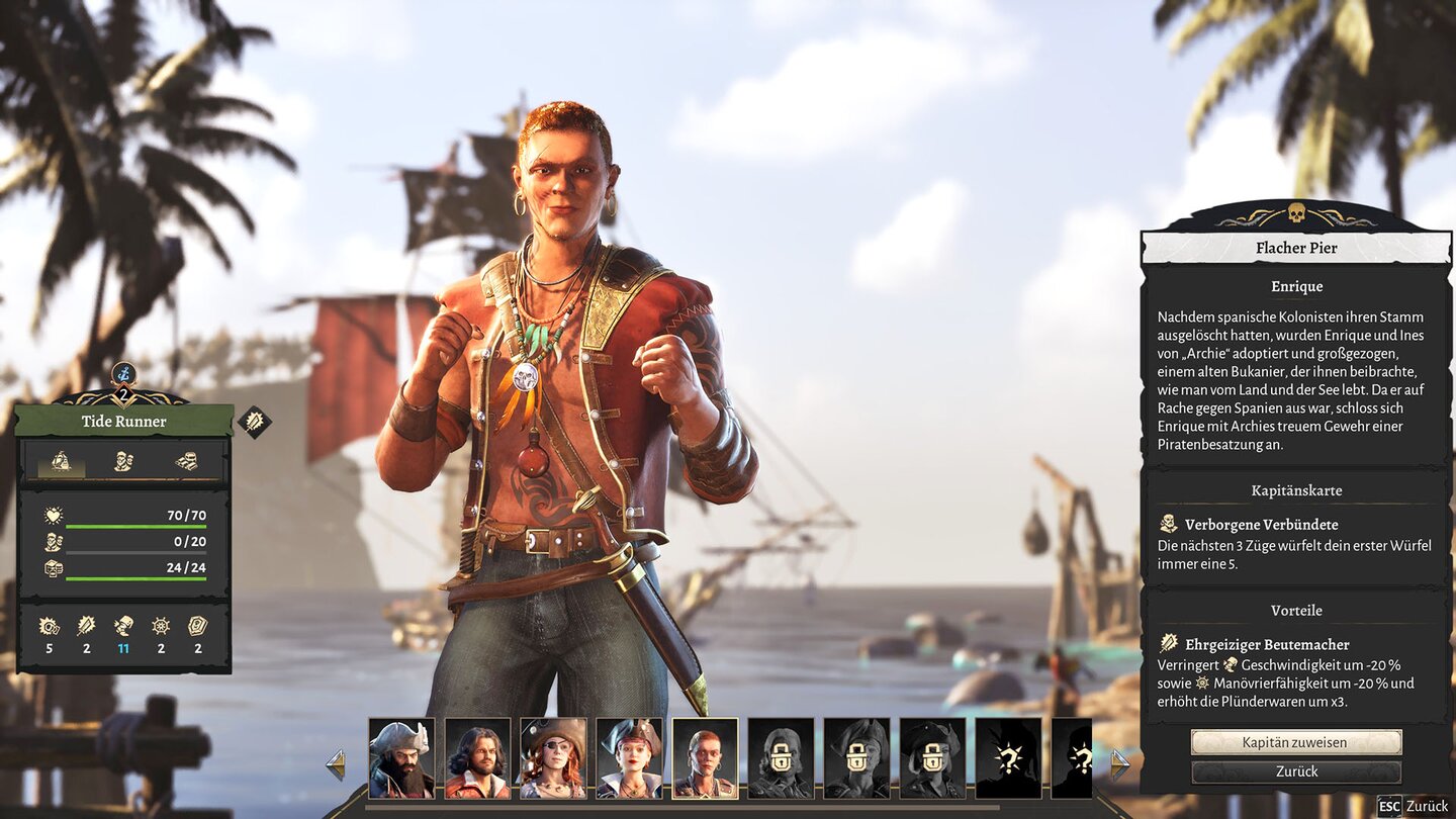 Wie effektiv ich meine Aktionen durchführe, entscheiden Würfelwürfe und die Fähigkeit des gewählten Kapitäns. Die bringen nämlich unterschiedliche Boni, wie zusätzliche Würfe oder die Chance auf zusätzliche Plünderwaren, und lassen sich über Karrierepfade freischalten: