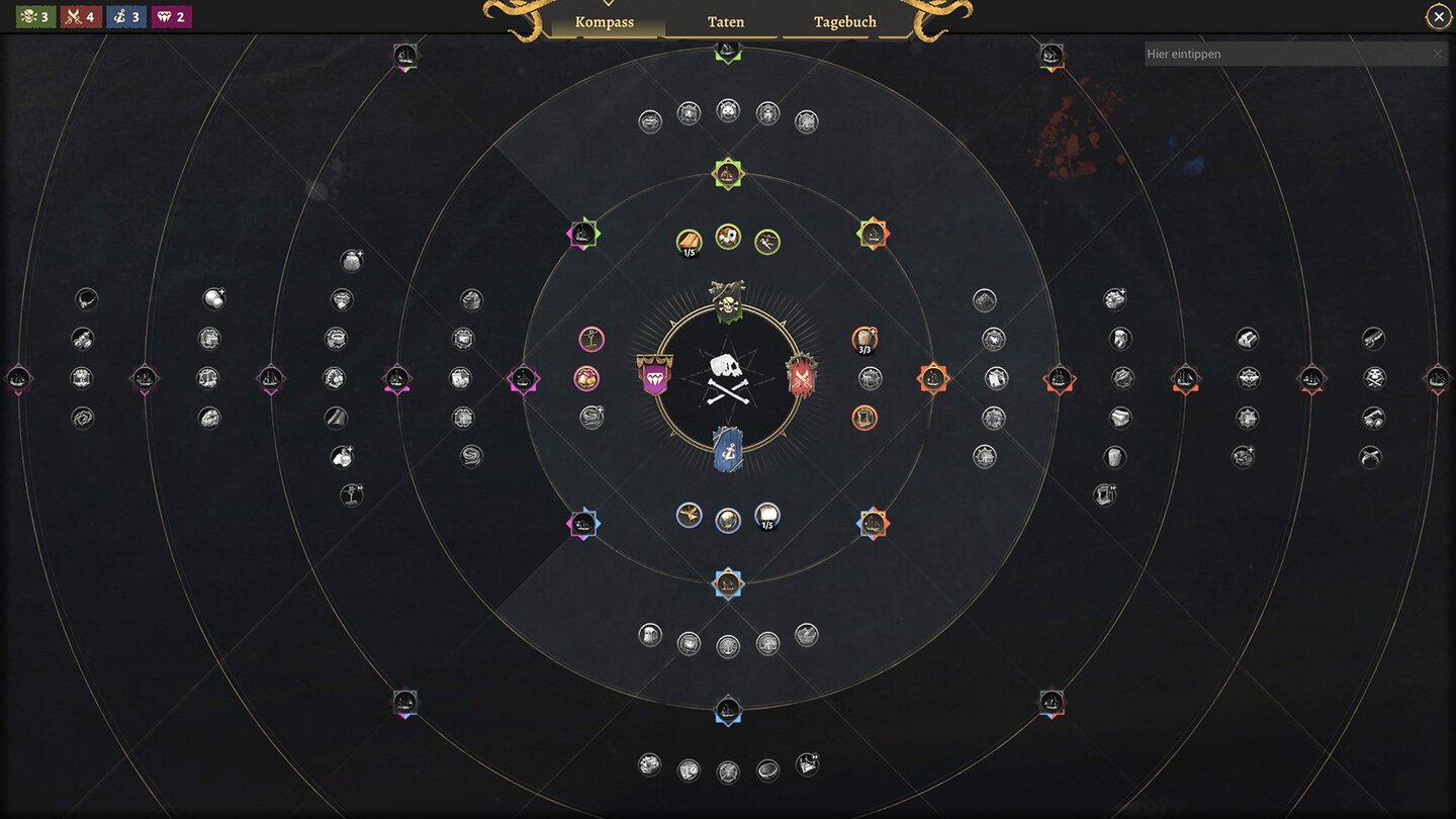 Der jeweilige Pfad, der in der Kompass-Übersicht eingeschlagen wird, entscheidet dabei, ob ich ein ruhmreicher Pirat bin, ein Entdecker, ein Kämpfer oder ein Händler. Ich musste mich aber nicht durchweg für eine bestimmte Rolle entscheiden, es stehen das ganze Spiel über alle Varianten zur Verfügung und es sollen auch alle Upgrades des jeweiligen Pfades in einem Durchgang freigeschaltet werden können.