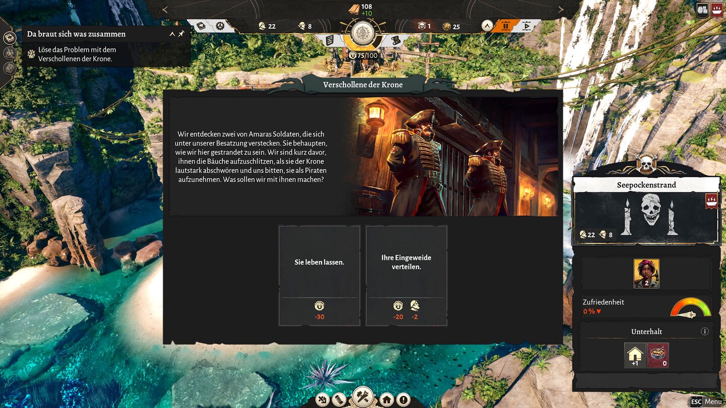 Richtige Revolten, wie sie ständig in Frostpunk drohten, waren bei meinem Demo-Durchgang aber eher selten und traten eigentlich nur dann auf, wenn ich mal unachtsam war und bei der Nahrungsversorgung geschludert habe, oder es nicht genug Behausungen für mein Piratenvolk gab. Ich kam also auf dem mittleren Schwierigkeitsgrad ziemlich locker durch.