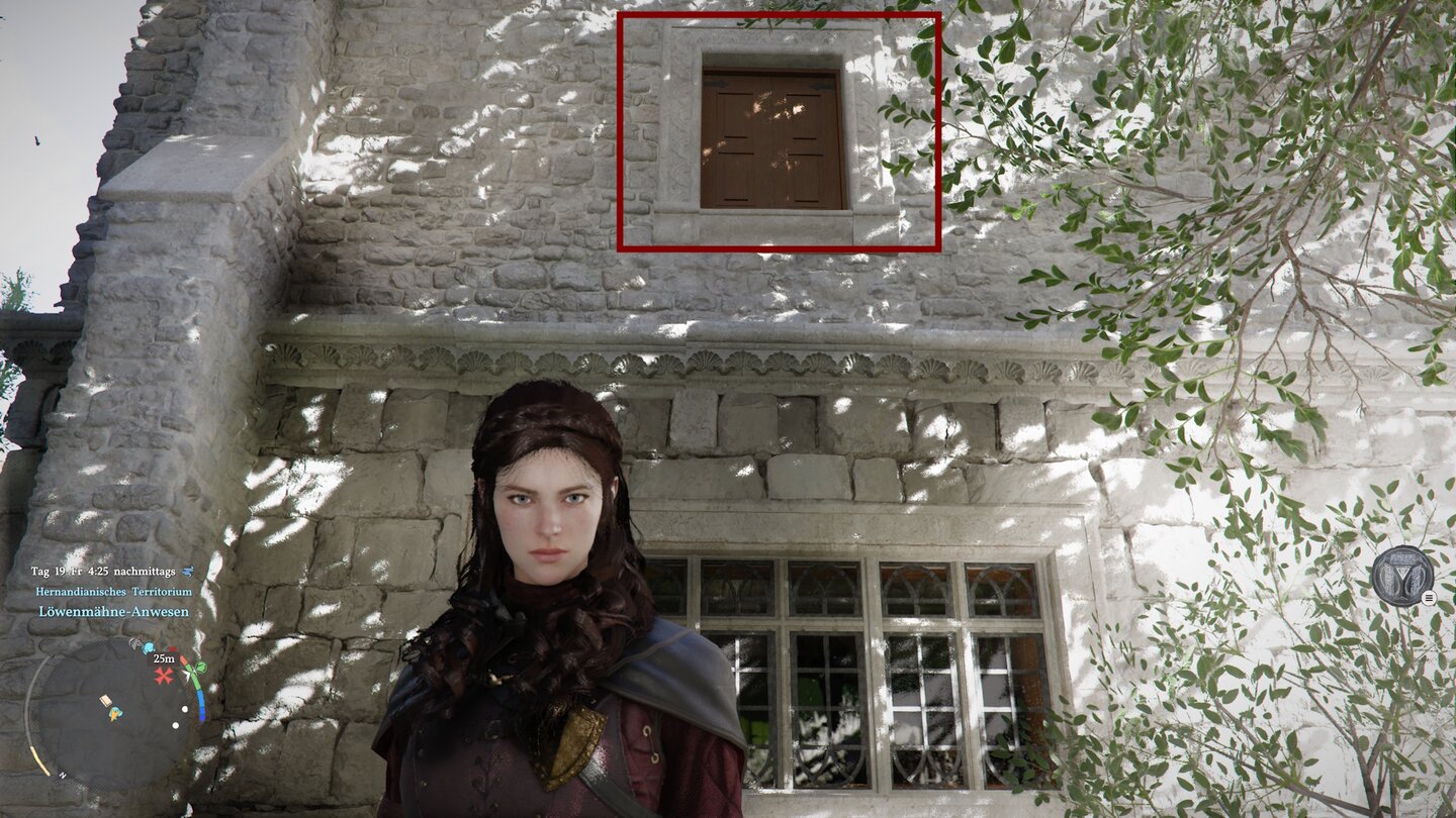 Klettert einfach zunächst auf den kleinen Absatz in der Wand, öffnet beispielsweise den ersten hölzernen Fensterladen links im ersten Stock und steigt rein.