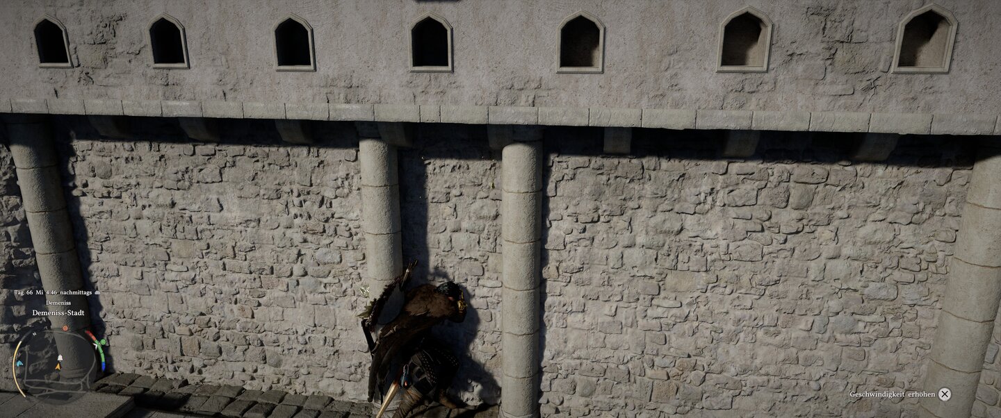 Für eine Brustrüstung, die eher in Richtung Black Flag geht, könnt ihr direkt in Demeriss bleiben. Geht diesmal in die Stadt und klettert auf den Uhrenturm. Auf halber Strecke könnt ihr gegen die Wand zwischen zwei Säulen drücken. Dahinter findet ihr die Helfryn-Lederrüstung.