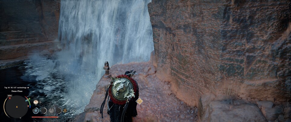 Einen passenden Umhang mit Kapuze findet ihr in der Kriegerseelenkaverne. Diese liegt nordöstlich von Demeriss, am Übergang zur Crimson Desert. Stellt euch vor den Wasserfall und nutzt den Stichangriff, um die Höhle dahinter zu betreten und den Plattenumhang des dunklen Schützen einzusammeln.