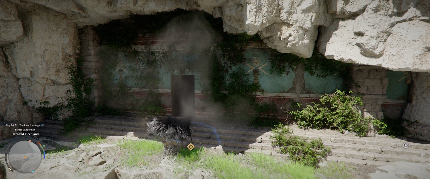 Wirklich interessant ist aber eine bemalte Felswand, ungefähr auf halber Höhe des Lochs. Gleitet mit dem Rabenmantel dorthin und drückt gegen die Stelle, die nicht vollkommen von Pflanzen bedeckt ist. Dadurch erreicht ihr die Kammer.