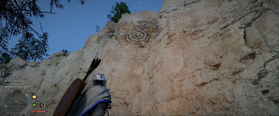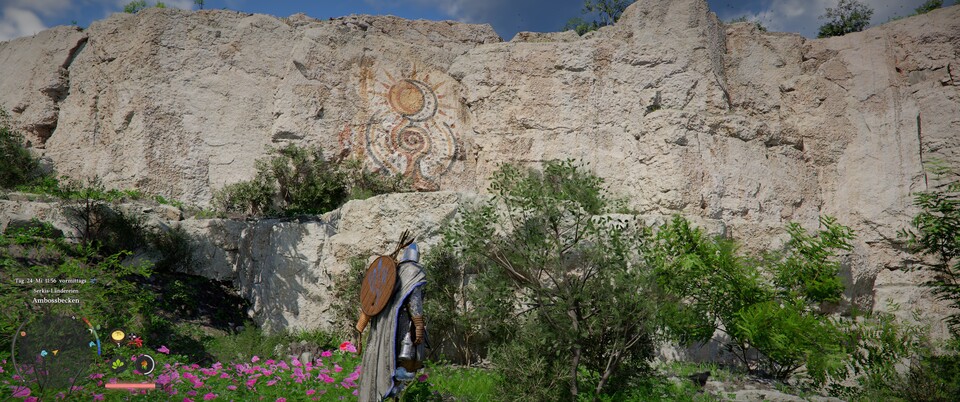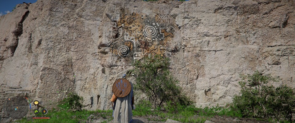 Die Karte beschreibt natürlich nicht, wonach ihr wirklich Ausschau halten müsst. Ihr sucht nach großen Bildern an Felswänden. Das erste findet ihr auf dem Weg zum Haus der Heilung zwischen dem Blütenwaldhof und der Halssius-Apotheke.
