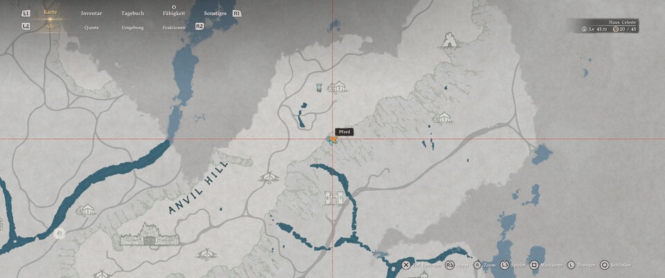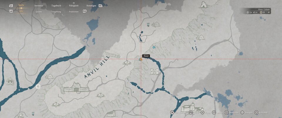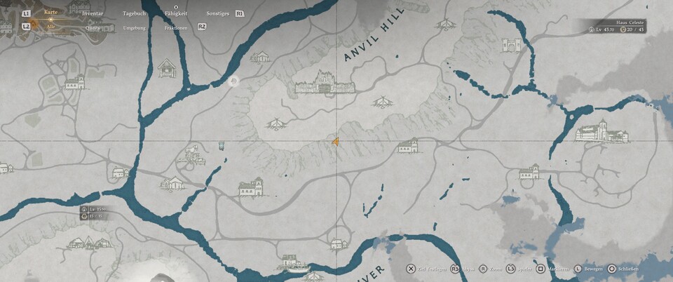 Die Karte ist sehr viel detaillierter als eure eigene und auch etwas gestaucht. Daher kann es schwierig sein, die Positionen richtig auszumachen. Aber mit etwas Fantasie erkennt man, dass es sich um den Weg zum Haus der Heilung von St. Hassius handelt. Das kennt ihr vielleicht schon, wenn ihr Kapitel drei der Hauptgeschichte bereits beendet habt.