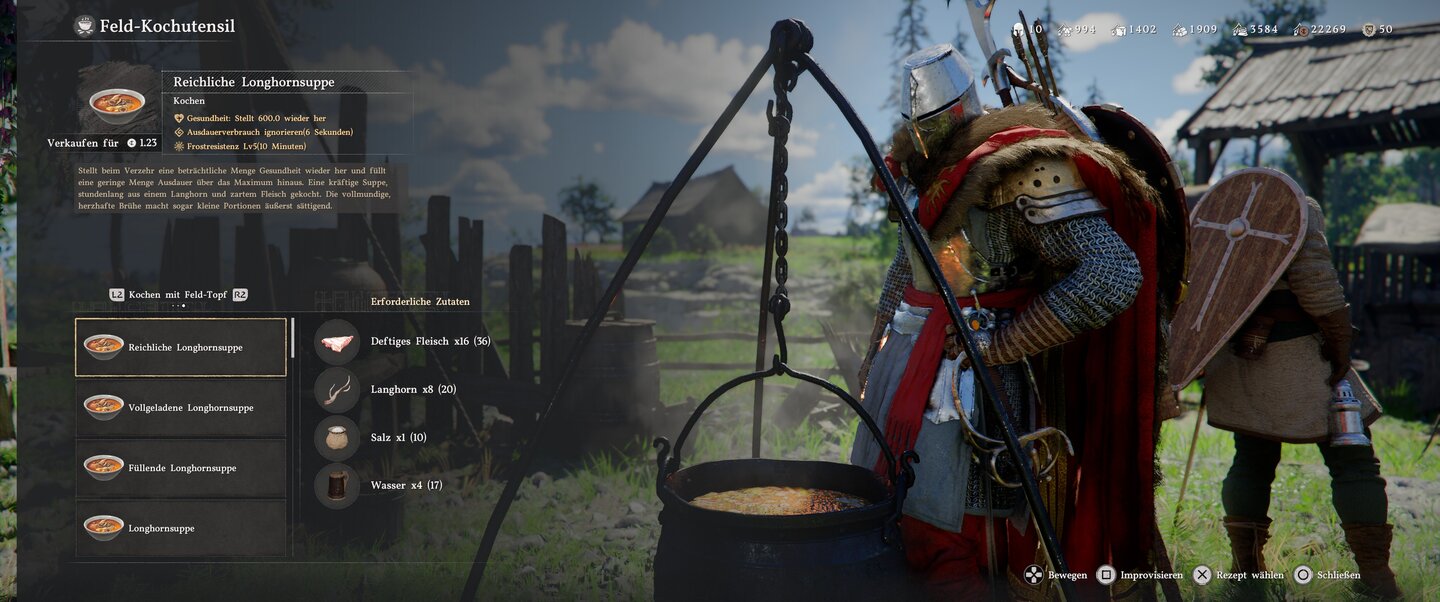 Andere Zutaten, wie Salz oder Fleisch, braucht ihr entweder nur in kleinen Mengen, oder ihr könnt sie problemlos in der Spielwelt und in großen Mengen besorgen. Nehmt daher jeden Tropfen mit, wenn ihr bei einem Händler vorbeikommt – auch wenn ihr gerade genug Heilmittel habt.