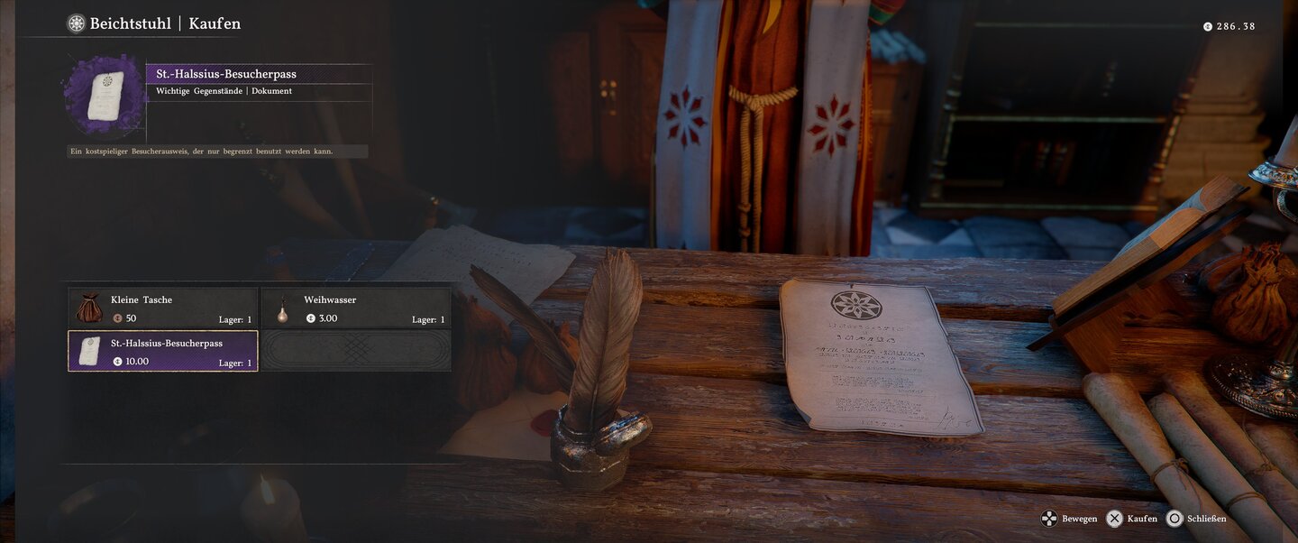 Wenn ihr den Umweg nicht scheut, könnt ihr auch noch einmal nach Hernand zurückkehren. Dort könnt ihr im Osten der Stadt die Kirche aufsuchen. Drinnen trefft ihr auf Alfred. Dieser erlässt euch nicht nur eure Sünden, wenn ihr mal ein Verbrechen begangen haben solltet, sondern hat auch einen St.-Halssius-Besucherpass im Angebot.