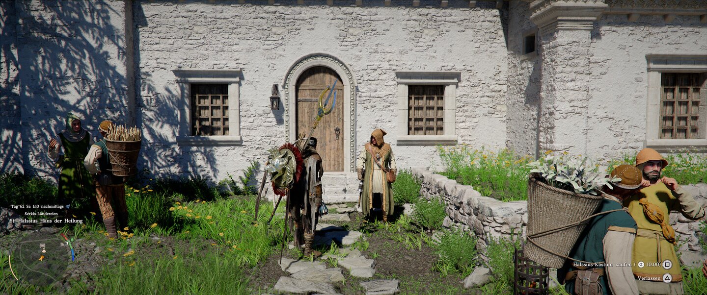 Wenn ihr vom Eingang aus nach rechts lauft, seht ihr direkt einen Seiteneingang. Dort steht eine Wache. Sprecht diese an und sie macht euch einen Vorschlag: Ihr zahlt zehn Silber und erhaltet ein Kostüm, mit dem ihr euch einfach durch das Haus der Heilung bewegen könnt.