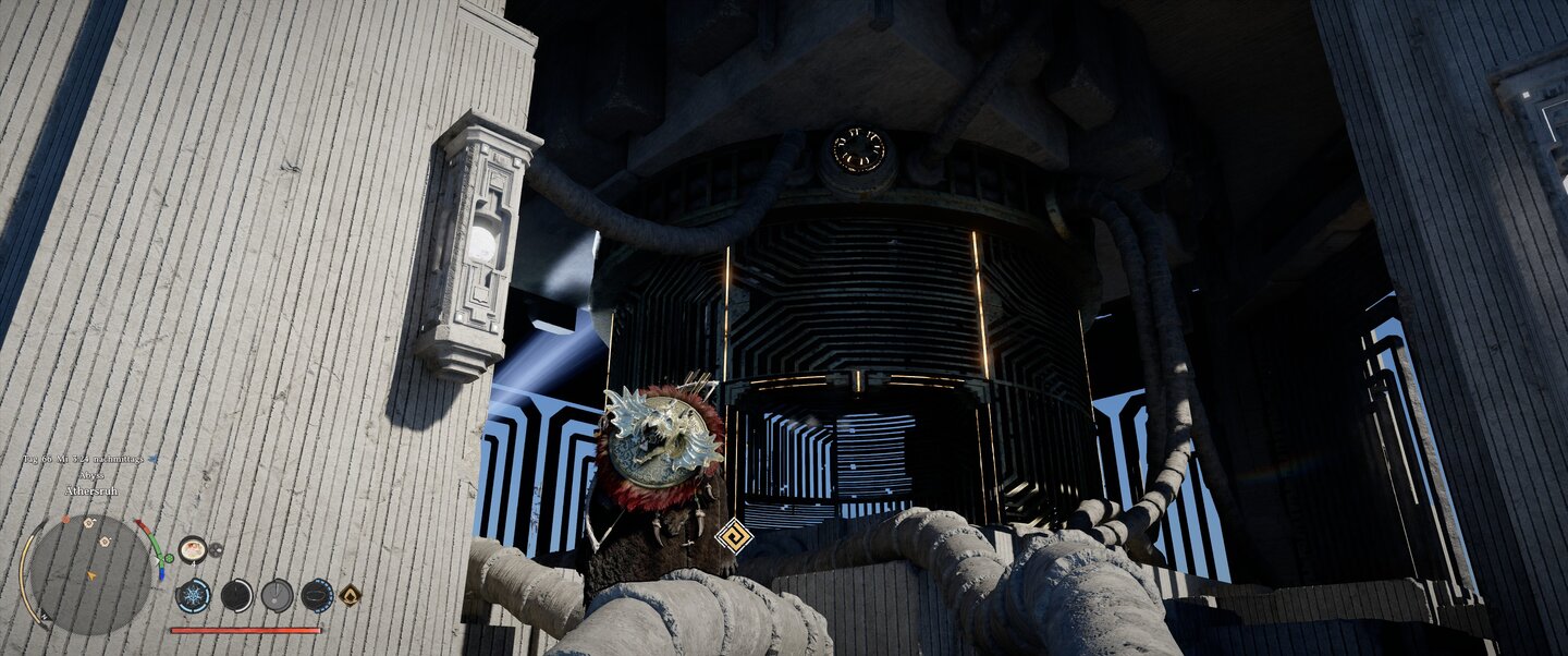 Klettert zuerst zur Spitze des Turms, was euch mit der Macht des Axioms leicht fallen sollte, und feuert auf die Halterung der Glocke. Diese stürzt dann den Turm hinunter und öffnet eine Kammer unter dem Turm. Dort wartet ein Boss auf euch.