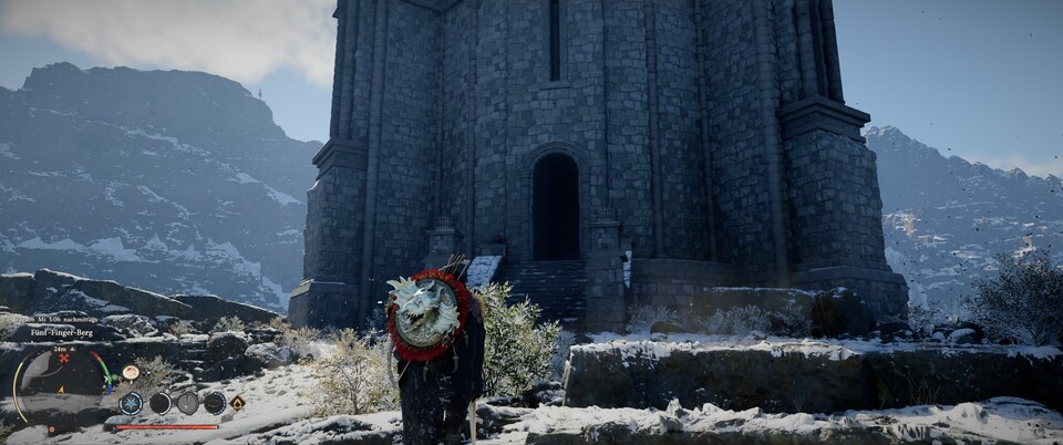 Hebt er ab, könnt ihr mit dem Kraftsprung zu ihm hochspringen, da er aber rasch ist und um sich herum Schaden verursacht, könnt ihr ihn auch mit dem Bogen beschießen. Das funktioniert auch gut, vor allem wenn ihr vorher ein paar Artefakte in den Bogen investiert habt – beispielsweise für Ausweichschuss.