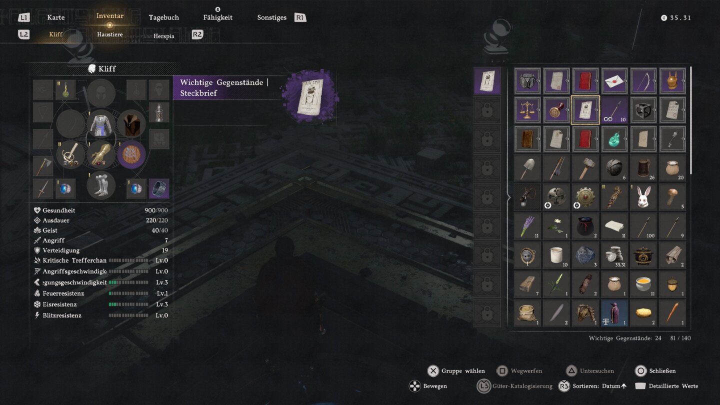 Ihr habt es bereits gelesen, während ich mit Kliff durch die Welt reise, sammle ich Rohstoffe, Pflanzen, Ausrüstung und Artefakte ein und all diese Gegenstände landen in meinem Inventar. Aber nicht nur die, denn dazu gesellen sich allerhand Questitems, Rezepte und Verbrauchsgegenstände – sogar mein Silbervorrat (die Währung im Spiel) belegt einen eigenen Slot.