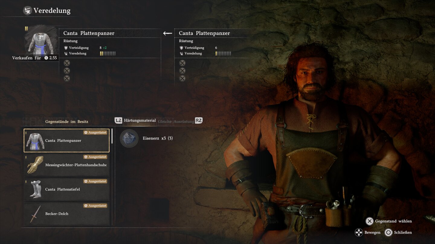 Die gesparten Exemplare kann ich dann verwenden, um stattdessen Lebenspunkte, Ausdauer und Geistkraft zu steigern. Im späteren Spielverlauf kann ich sie aber auch nutzen, um die Ausrüstung zu verbessern.