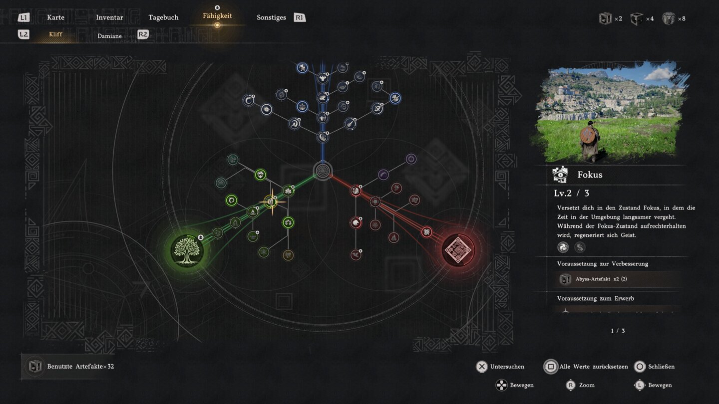 Einmal geöffnet, kann ich die Artefakte dann für verschiedene Dinge einsetzen. Ich kann zum Beispiel neue Skills in einem großen Fertigkeitenbaum erlernen. Nach der Freischaltung kann ich die dann häufig noch mit weiteren Artefakten verbessern oder erweitern.
