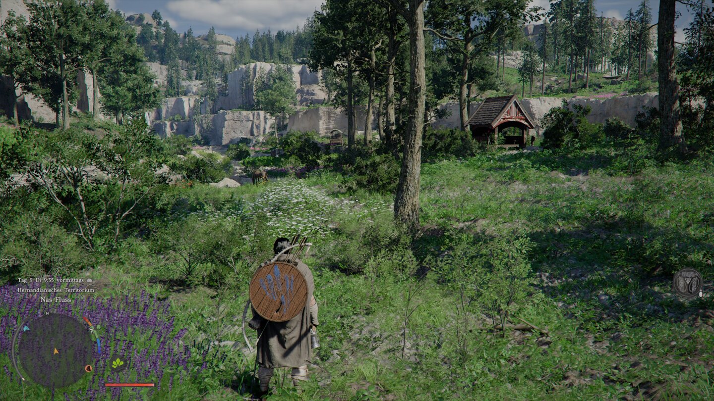 So funktioniert das Camp: Schon nach ungefähr 3-4 Stunden schalte ich das Lager frei, das wie ein Hub für viele Aktivitäten und Charaktere funktioniert. Mit der Zeit schalte ich dort – beispielsweise über neue Graumähnen-Mitglieder – neue Möglichkeiten frei. Ich kann etwa weitere Aufträge annehmen, Handel betreiben oder verschiedene wichtige NPCs wie einen Schmied ansiedeln. Auch kann ich dort Landwirtschaft betreiben und mich mit vielen wichtigen Ressourcen versorgen.
