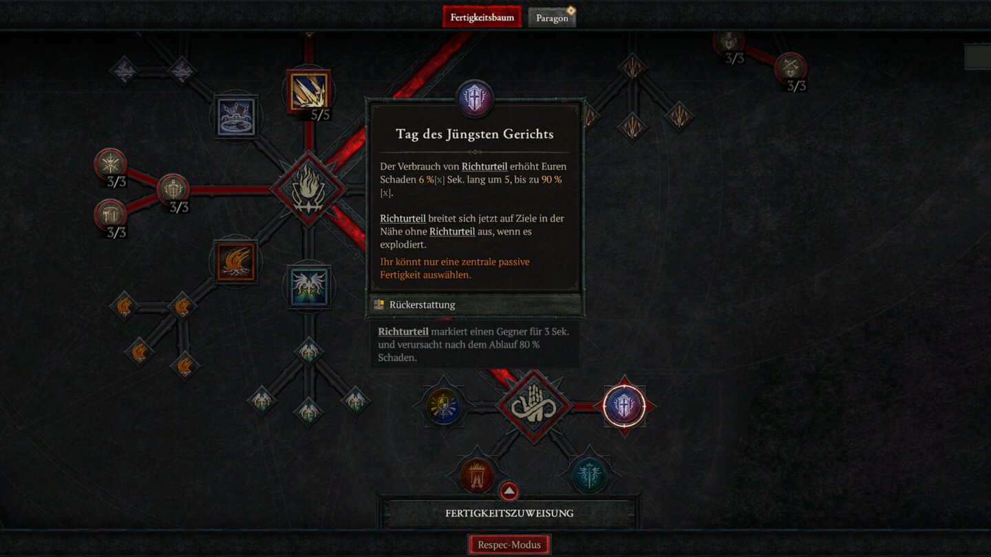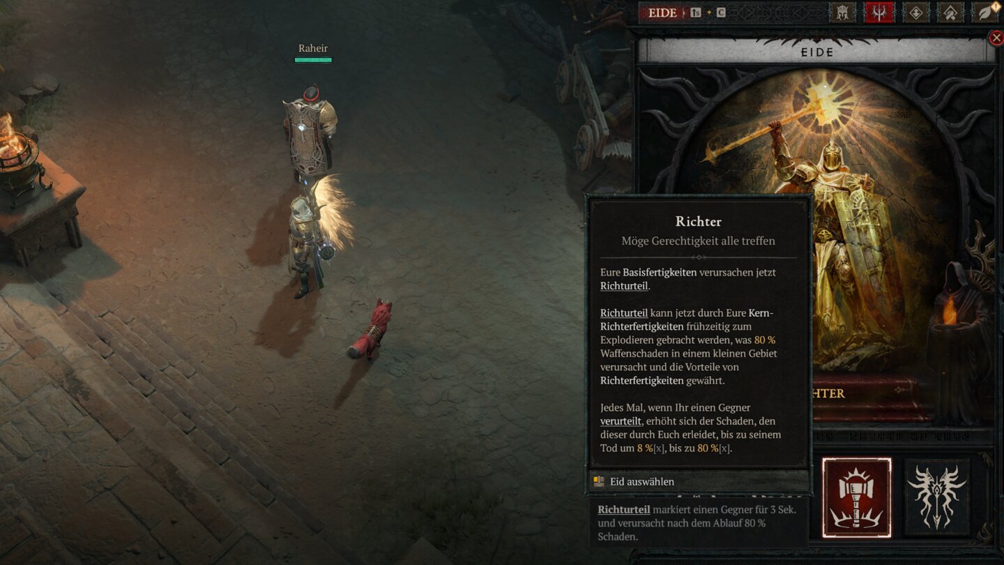 Wir haben uns für den Eid des Richters entscheiden, der euch mehr auf Richturteile spezialisiert. Diese sind wie ein Echo. Ihr markiert Gegner mit einem Angriff und nach 3 Sekunden erhalten sie noch einmal 80% des ursprünglichen Schadens.