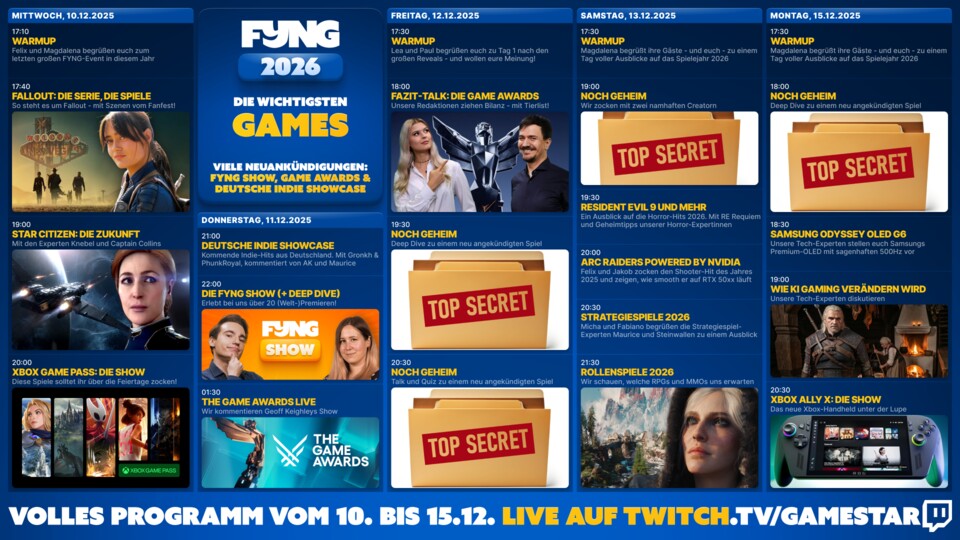 Unser Show-Programm könnt ihr entweder live auf unserem GameStar-Twitch-Kanal verfolgen oder natürlich auch hier auf eurer Lieblings-Website. Die FYNG Show 2026 am Donnerstag übertragen wir außerdem auf dem GameStar-YouTube-Kanal. Das sind unsere Sendezeiten: