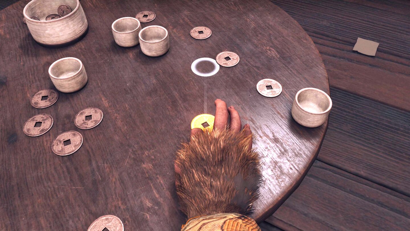 Beim Glücksspiel in Ghost of Yotei ist entgegen der Bezeichnung weniger Glück gefragt, sondern eher motorisches Können. Ihr müsst Münzen mit der R2-Taste schnippsen, wobei der Spannungsgrad des Triggers die Intensität des Schusses bestimmt.