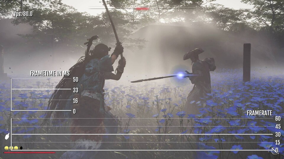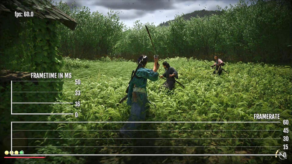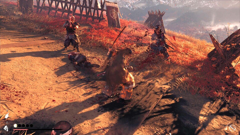 Da sich Atsu zumeist mit ganzen Gruppen von Gegnern anlegt und unzählige dynamische Effekte den Bildschirm füllen – etwa im Wind wiegende Gräser, fallende Blütenblätter oder Fontänen an Blut – ist der Leistungsmodus in unseren Augen die beste Wahl. Hier behaltet ihr stets den Überblick und könnt auch flotter auf Banditen, Bären und feindliche Samurai reagieren.