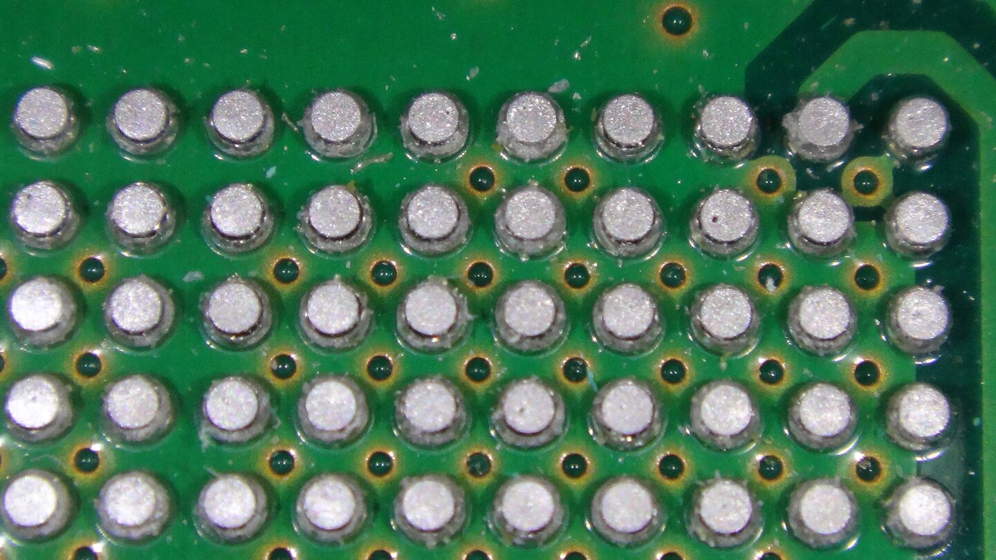 Aber auch alle anderen Komponenten wie Speichermodule, Widerstände und Anschlüsse sind angelötet. Durch den 'Reflow' schließen sich mikroskopisch kleine Lücken im Zinn, der Stromfluss wird durch das Verfahren also wiederhergestellt.