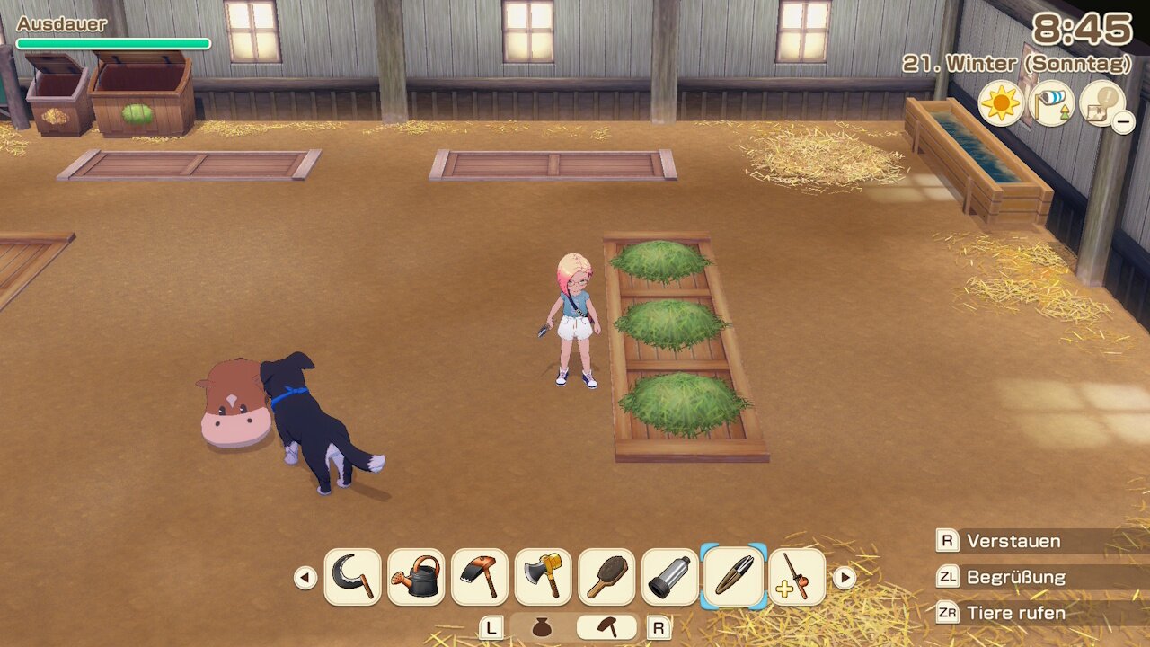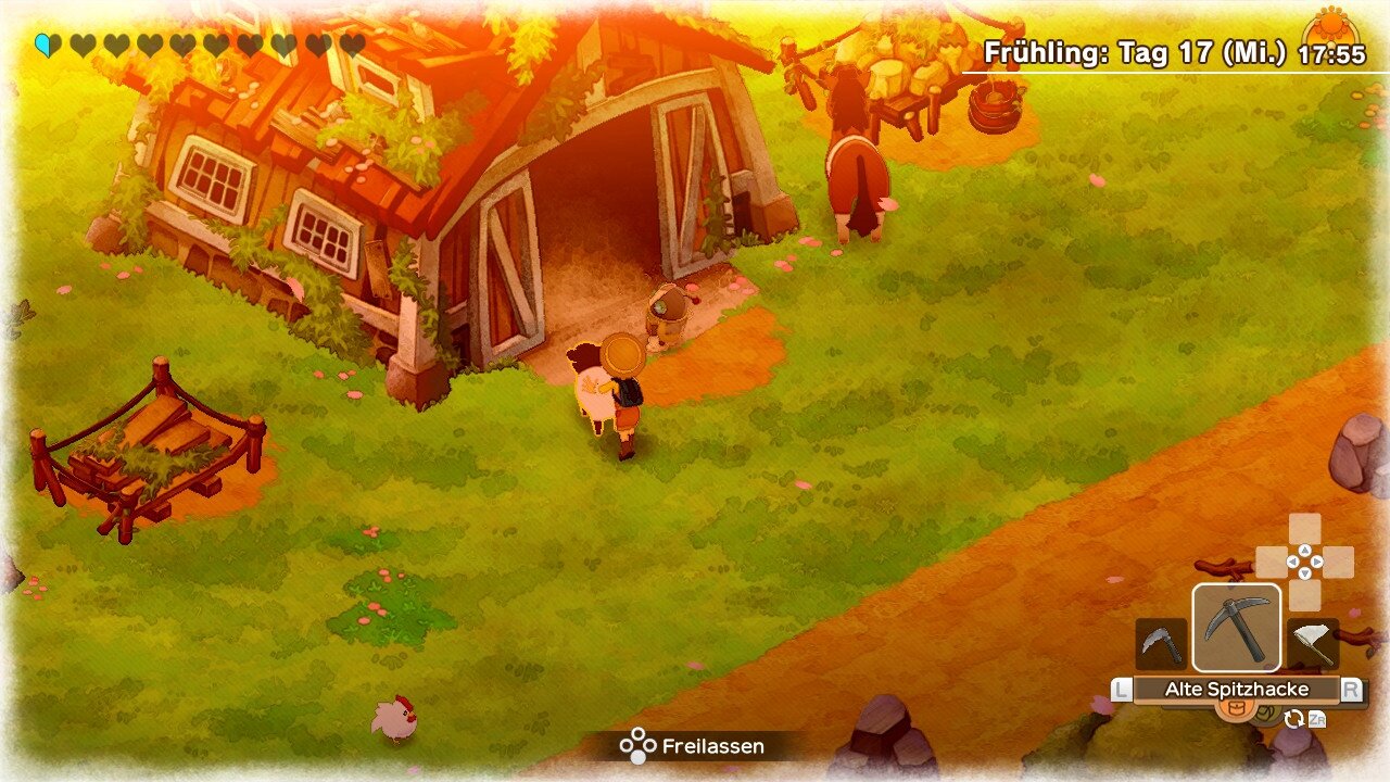 Für Abwechslung sorgen dabei dann vor allem Dialoge und nette kleine Zwischensequenzen mit den Dorfbewohner*innen. Und in denen geht es ständig um das Miteinander und die Gemeinschaft. Um aber überhaupt mal jemanden zu treffen, muss ich in den allermeisten Fällen erst mal ins Dorf latschen oder reiten, weil sich bei mir auf dem Hof nur im Ausnahmefall mal jemand blicken lässt.