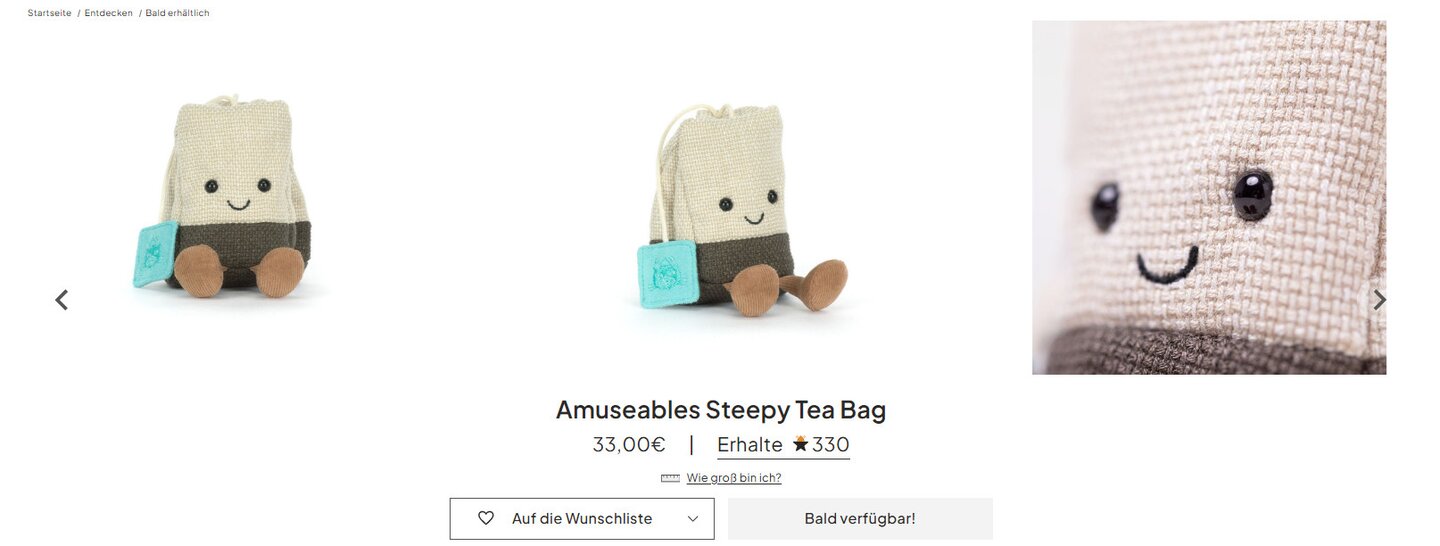 Wenn ihr Zugriff auf den Early Access habt und nur den Teebeutel haben wollt, dann könnt ihr diesen immer noch bestellen. Alle anderen Jellycats werden im Laufe des Tages freigeschaltet. Gerade der neue Bartholomew Bear sowie die Hasen sind erfahrungsgemäß schnell ausverkauft. Aber auch die Taube, die auch im Early Access verfügbar war, ist schnell ausverkauft gewesen.