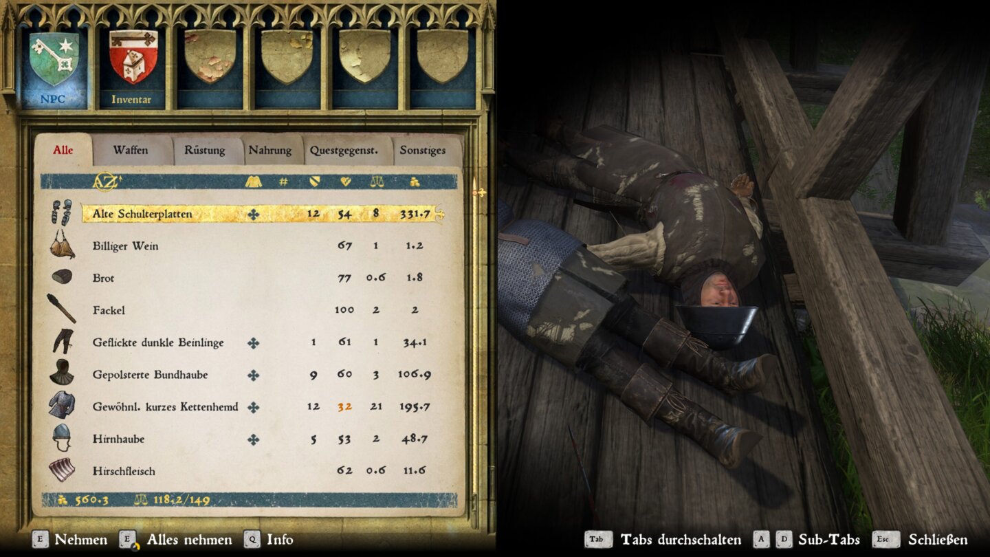Bei Rüstungen und Waffen sieht das anders aus: Diese sind sehr schwer, wenn ihr sie nach Rattay transportieren wollt. Überlegt euch also gut, was ihr plündert. Eine Rüstung, die mehrere Kilo wiegt, aber nur 100 Groschen wert ist, solltet ihr gar nicht erst aufheben. Selbst mit eurem Pferd lässt sich nicht alles mitnehmen.