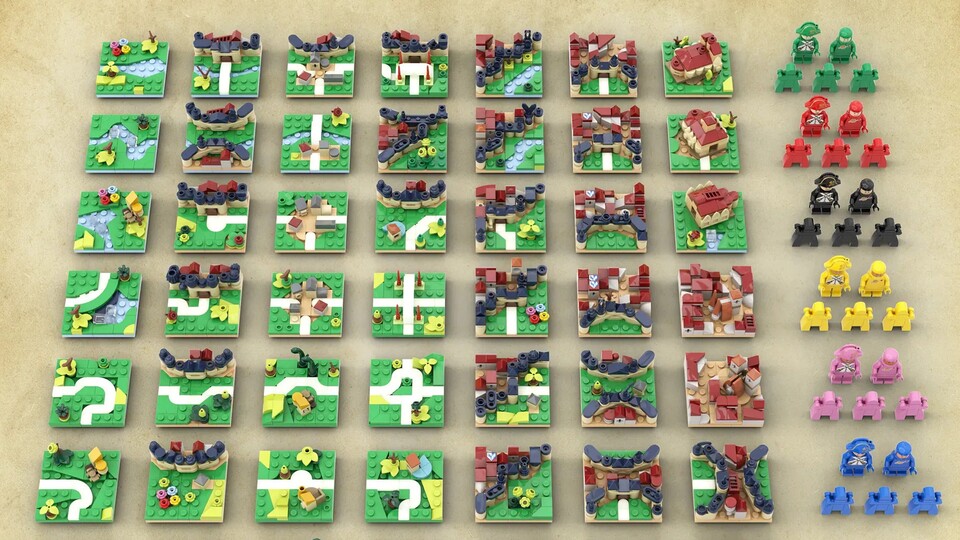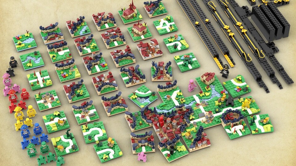 Die Plättchen lassen sich dann ganz normal aneinanderpuzzeln, grundsätzlich funktioniert das LEGO-Carcassonne genau wie die berühmte Brettspielvorlage. Das Basispiel besteht aus 49 Plättchen, soll über 3400 Teile haben und für 2 bis 6 Personen spielbar sein. Und wer mag, kann sich eine zusammengesetzte Landschaft mithilfe von entsprechenden Rahmenteilen an die Wand hängen.