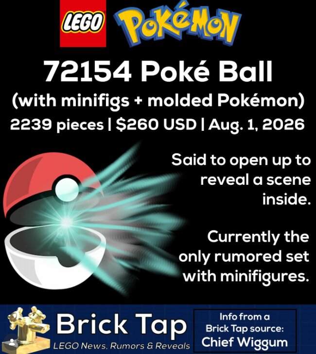 Hinweis: Wir stufen den Leak von Brick Trap bzw. Chief Wiggum als sehr verlässlich ein, da es sich hier um eine gut vernetzte LEGO-Community handelt. Genießt die Angaben aber natürlich dennoch mit Vorsicht. Offiziell bestätigt ist der LEGO-Pokéball samt Minifiguren nicht.