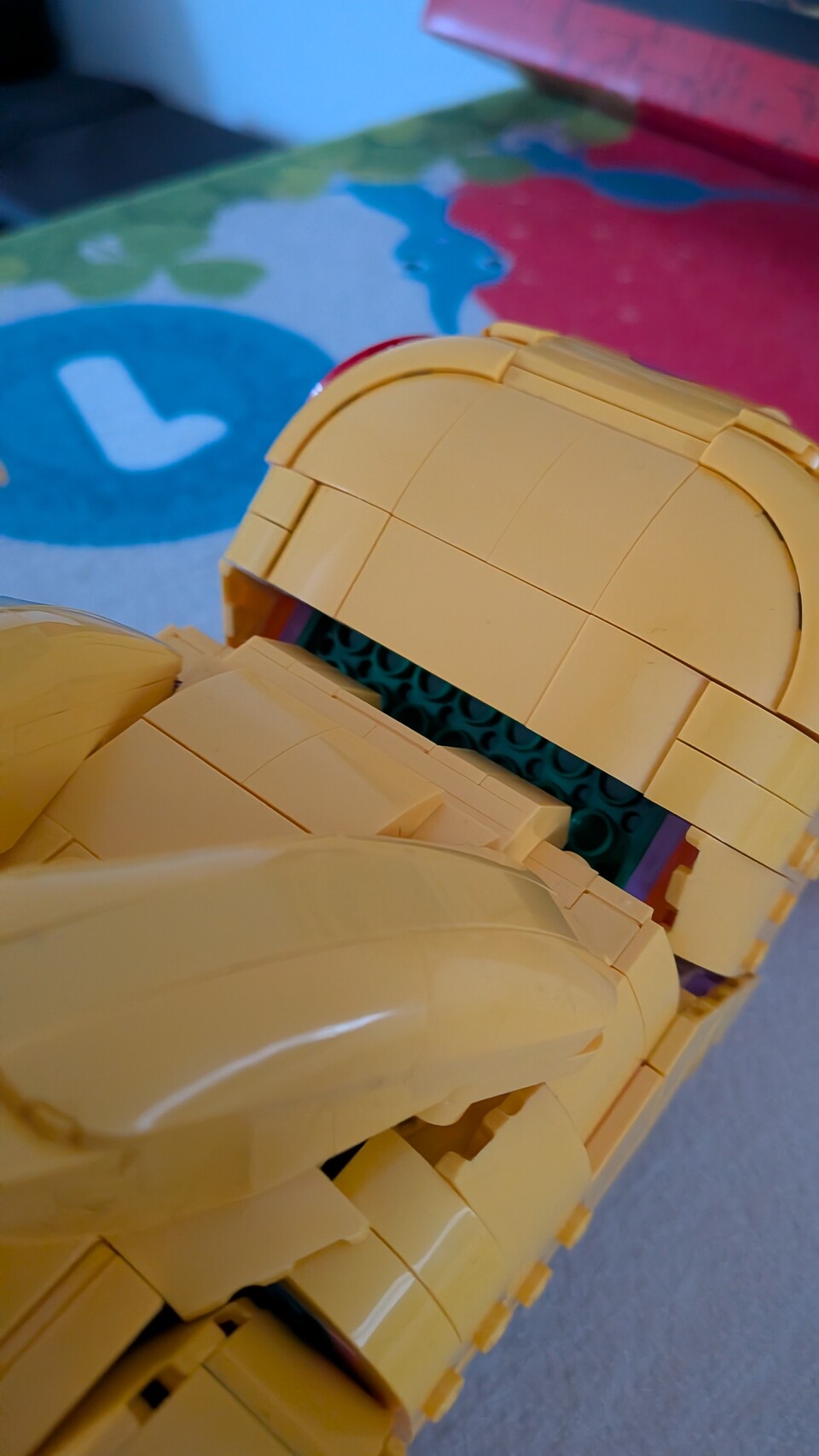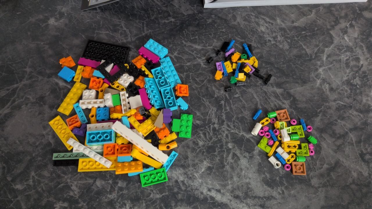 Zudem ist das Set nicht ganz stabil: Bei einem Set zum Ausstellen kann es schon manchmal sein, dass ich es nur vorsichtig hochnehmen kann – es ist also nichts Neues, wenn mir das Taschenmonster mal ein bisschen auseinanderfällt. Aber beim Bau gab es immer wieder Momente, wo ich mich wirklich gefragt habe, warum manche Teile an so wenigen Noppen hängen. Ein Teil des Hinterkopfes zum Beispiel hängt an drei Noppen, wovon eine sich mit etwas Druck leicht lösen lässt und dann im Inneren des Kopfes landen kann. Solche groben Bauschritte habe ich bei LEGO bisher nicht erlebt.