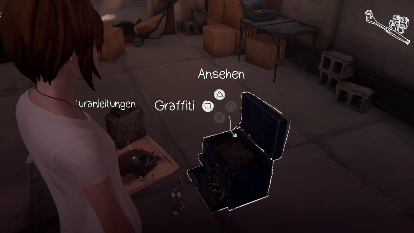 Habt ihr das Haus verlassen und mit David geredet, wird euch dieser bitten, einen Schraubenschlüssel aus der Garage zu holen. Geht in die Garage, nehmt den Schlüssel aus dem Werkzeugkasten, klickt ihn danach nochmal an und bekritzelt ihn mit eurer Zeichnung.