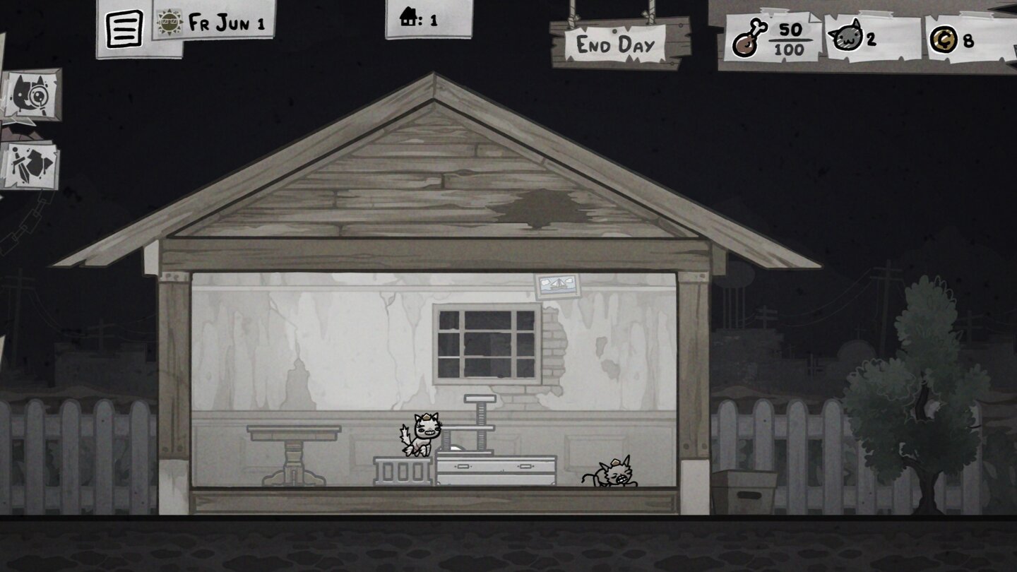 Das Ganze erinnert zumindest im Ansatz an Lebenssimulationen wie Die Sims, ist nur weit abgespeckter und dafür abgedrehter. Sprich, ihr müsst eure Katzen mit auf den Runs gefundenem Essen füttern und schauen, dass sie sich im Haus wohlfühlen.