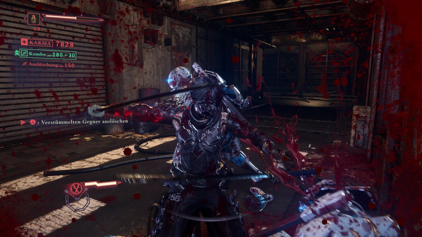 Selbst nervöses Button-Mashing sorgt in der Regel noch dafür, dass das auf dem Bildschirm gezeigte an eine wunderschön grausame Choreografie der Schnetzelei erinnert. Der hohe Gewaltgrad ist dabei übrigens auch relevant für das Gameplay.