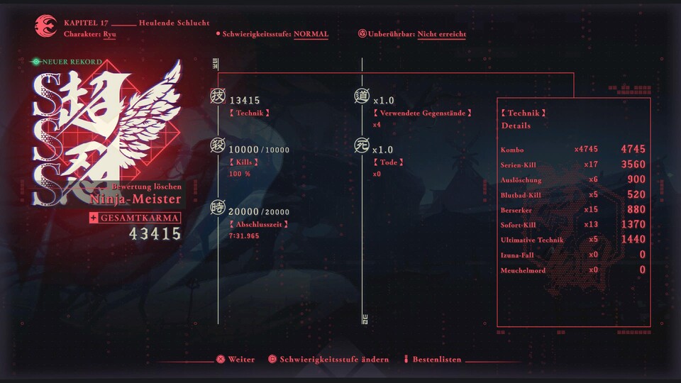 Auf “Schwer” steigt die Herausforderung dann ordentlich an. Hier sind das Timing und Beherrschen der wichtigsten Moves deutlich wichtiger. Nach dem erstmaligen Abschluss der Geschichte schaltet ihr zudem den “Meisterninja-Modus” frei, der euch dann wirklich alles abverlangt. Selbst kleinere Gegner erledigen euch dann schneller, als ihr “Ninja” sagen könnt.