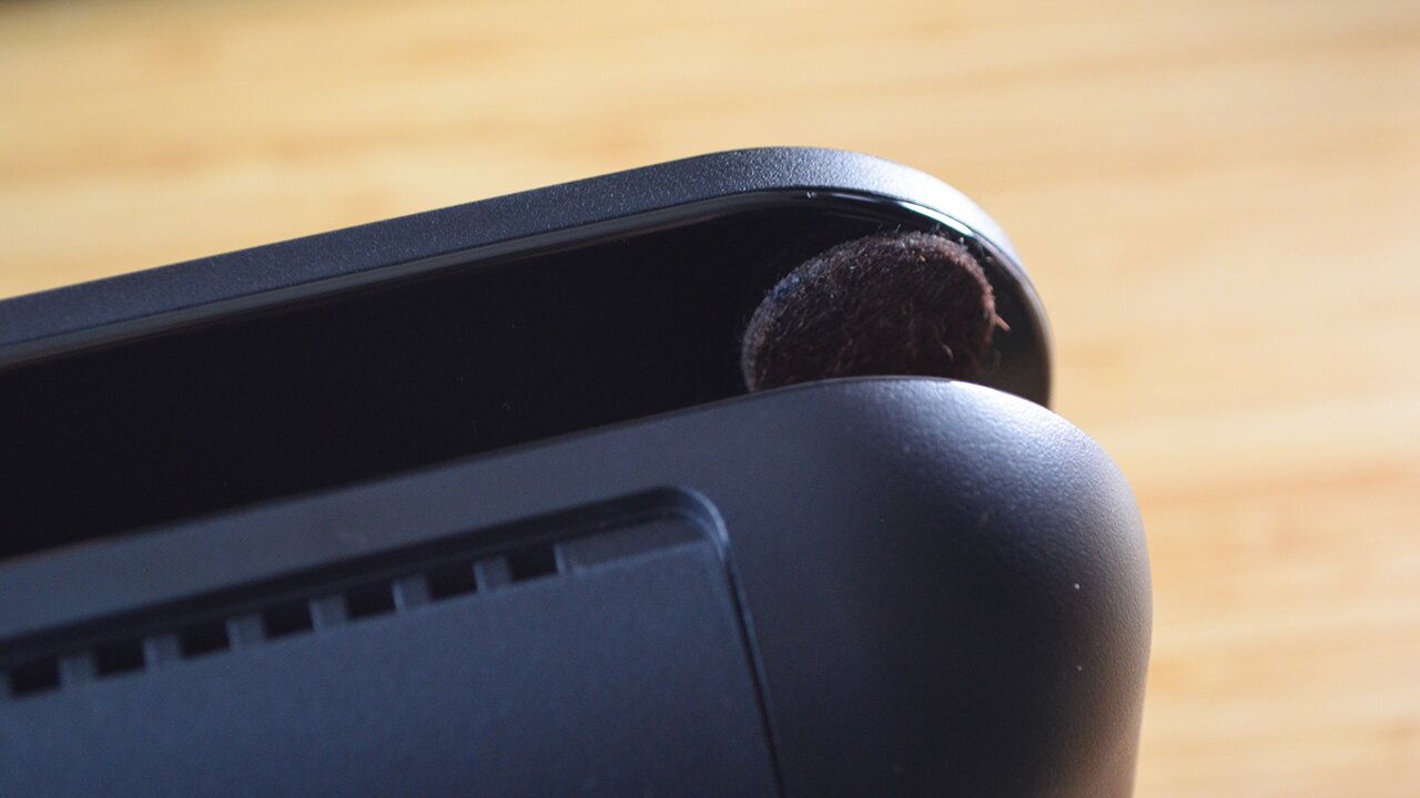 Also hab ich kurzerhand in der Dockingstation innen jeweils links und rechts einen Filzgleiter an die Seite geklebt, die dem Bildschirm der Switch 2 zugewandt ist. Wo meine Switch 2 beim Probe-Einstecken zuvor noch ordentlich im Dock hin und her gewackelt hatte, konnte ich jetzt direkt einen Unterschied merken.