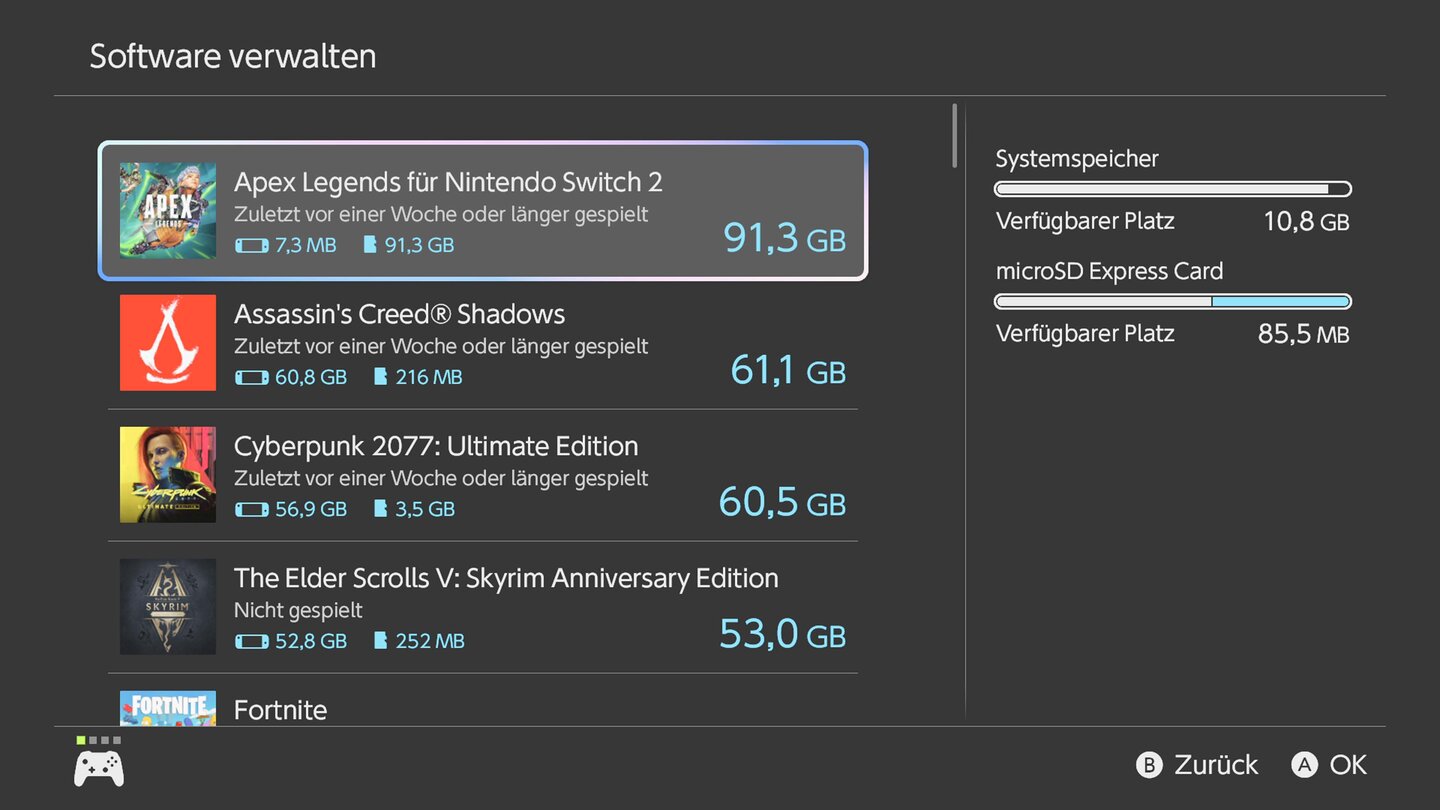 Die Switch 2 lädt Spiele jetzt sehr schnell runter, aber bietet sie überhaupt die notwendigen Kapazitäten, um viele davon dauerhaft zu speichern? Grundsätzlich schon, aber meiner Ansicht nach nicht dann, wenn ihr viele Spiele digital kauft oder Free-2-Play-Shooter wie Apex Legends oder Fortnite zockt.