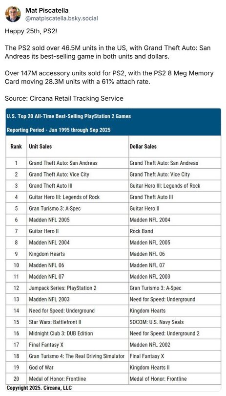Vor wenigen Tagen war der 25. Geburtstag der PlayStation 2, zumindest was den US-Release angeht. Zu diesem Anlass hat der Analyst Mat Piscatella eine Liste mit den meistverkauften Spielen der Sony-Konsole veröffentlicht, und zwar sortiert nach Einheiten und Umsatz. Die Liste wirkt auf den ersten Blick nicht sehr überraschend, ist aber trotzdem überaus interessant.