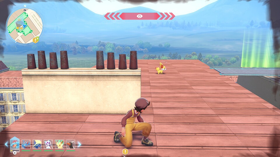 Von hier aus lauft ihr das Dach entlang gen Nordosten. Fynx taucht hier direkt vor dem Ausgang des Sektors auf dem Dachvorsprung auf. Aber Achtung, es ist scheu. Schleicht euch also vorsichtig an und setzt auf Flottbälle oder Superbälle.