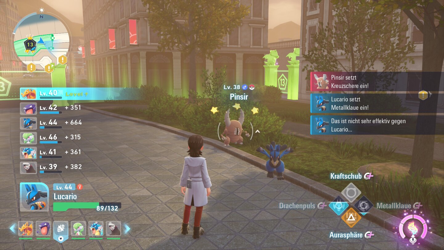 Begebt euch dafür in eine Wildzone, in der die Pokémon ein möglichst hohes Level haben, ihr sie aber trotzdem mit einem Schlag besiegt. Füllt den Rest eures Teams dann mit Pokémon, die ihr aufleveln möchtet. Denn auch Pokémon, die nicht am Kampf teilnehmen, erhalten Erfahrung.