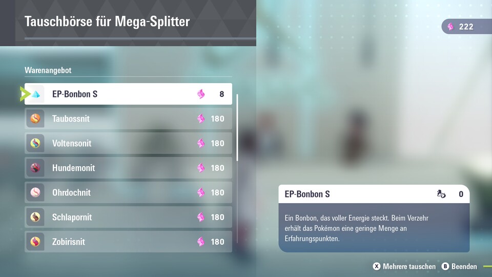 Mega-Splitter findet ihr überall in der Welt in Form von rosanen Kristallen, die eure Pokémon zerstören können. Diese lassen sich dann bei einem Händler der Quazar Corporation gegen EP-Bombons eintauschen, sobald ihr diese in Storymission 08 erreicht habt.