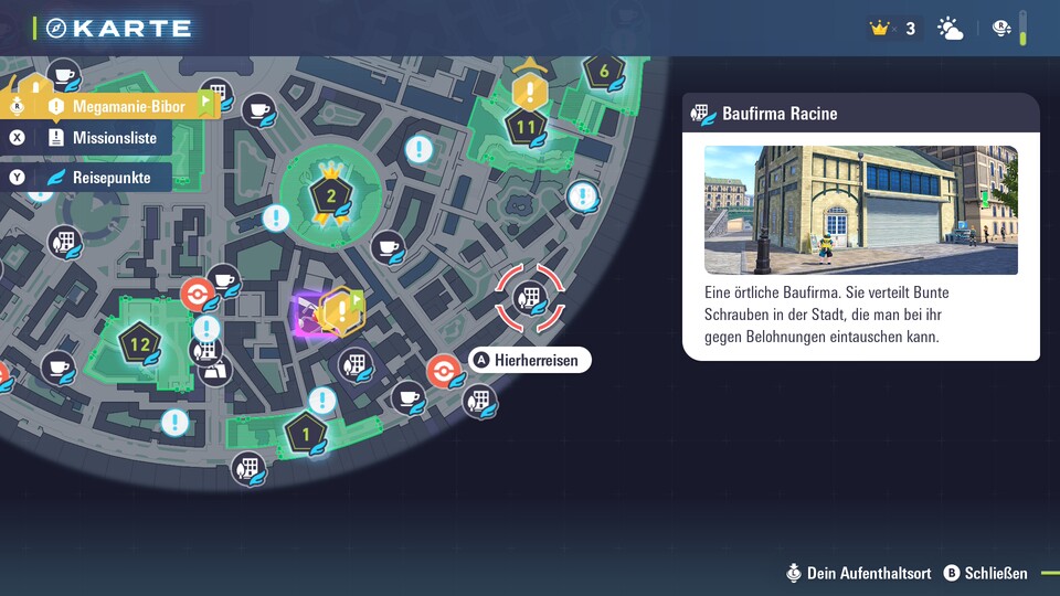 Wenn ihr durch die Stadt zieht, werdet ihr immer wieder auf lila Pokébälle stoßen. Die enthalten Bunte Schrauben. Diese könnt ihr dann gegen Canary-Anhänger bei der Baufirma Racine im Südosten eintauschen.