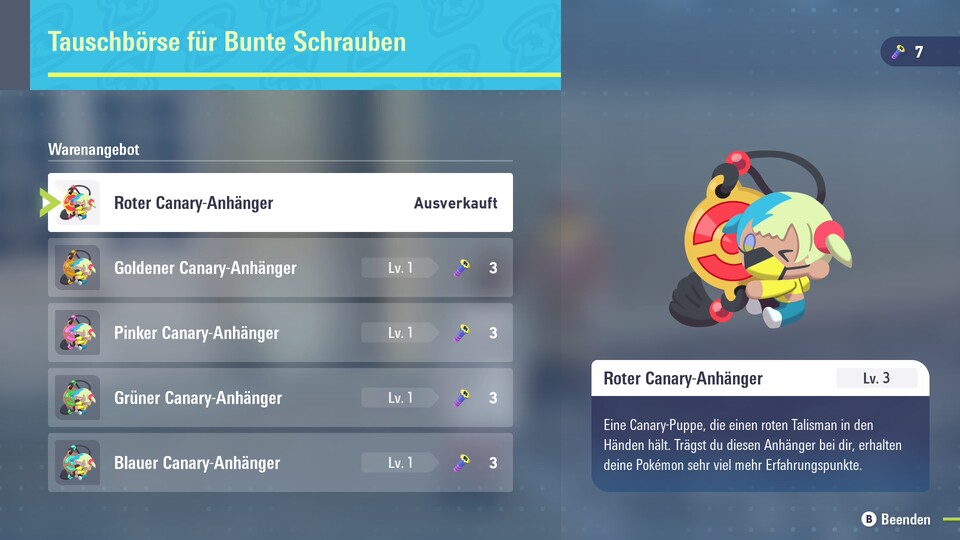 Diese Anhänger können die unterschiedlichsten Dinge verbessern, darunter auch die Erfahrung, die eure Pokémon erhalten. Kauft die beiden Verbesserungen für fünf, bzw. acht Schrauben so früh wie möglich. Den ersten Anhänger bekommt ihr während der Storymission 05 geschenkt.