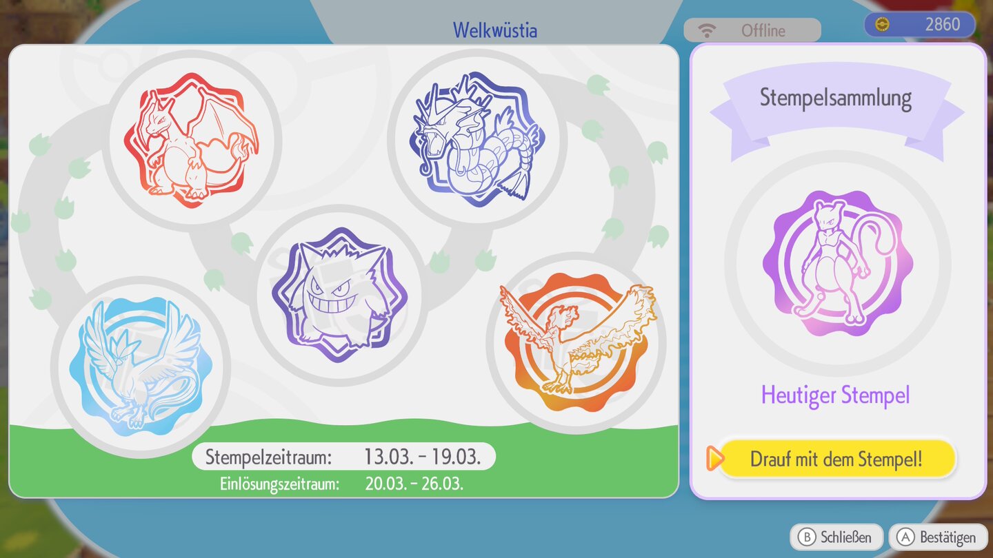 Es ist übrigens möglich, den gleichen Stempel mehrmals zu erhalten. Um die maximale Belohnung aus der Stempelkarte herauszuholen, solltet ihr also nicht nur täglich die entsprechenden Pokémon Center abklappern, sondern auch lieber auf doppelte Stempel statt einer bunten Vielfalt setzen.
