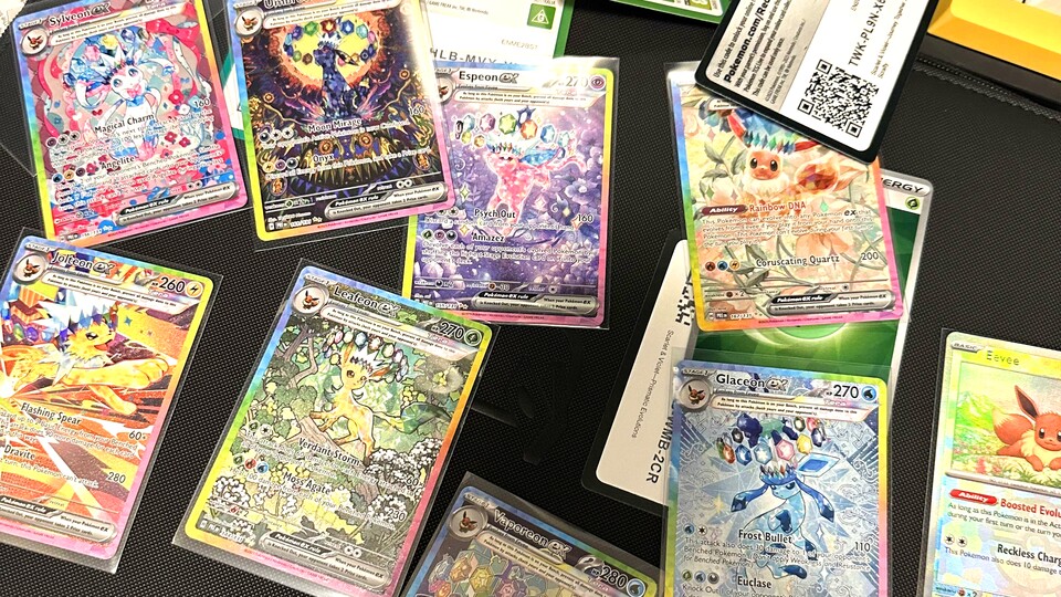 In diesem Fall hier geht es um Karten aus der Prismatische Entwicklungen-Erweiterung. Schaut ihr euch die Karten auf Seiten wie CardMarket an und sortiert sie absteigend nach Preis, werdet ihr dort genau die Karten ganz oben sehen, die hier anscheinend alle aus einem einzigen God Pack gefischt worden sind. Aber am besten seht ihr selbst: