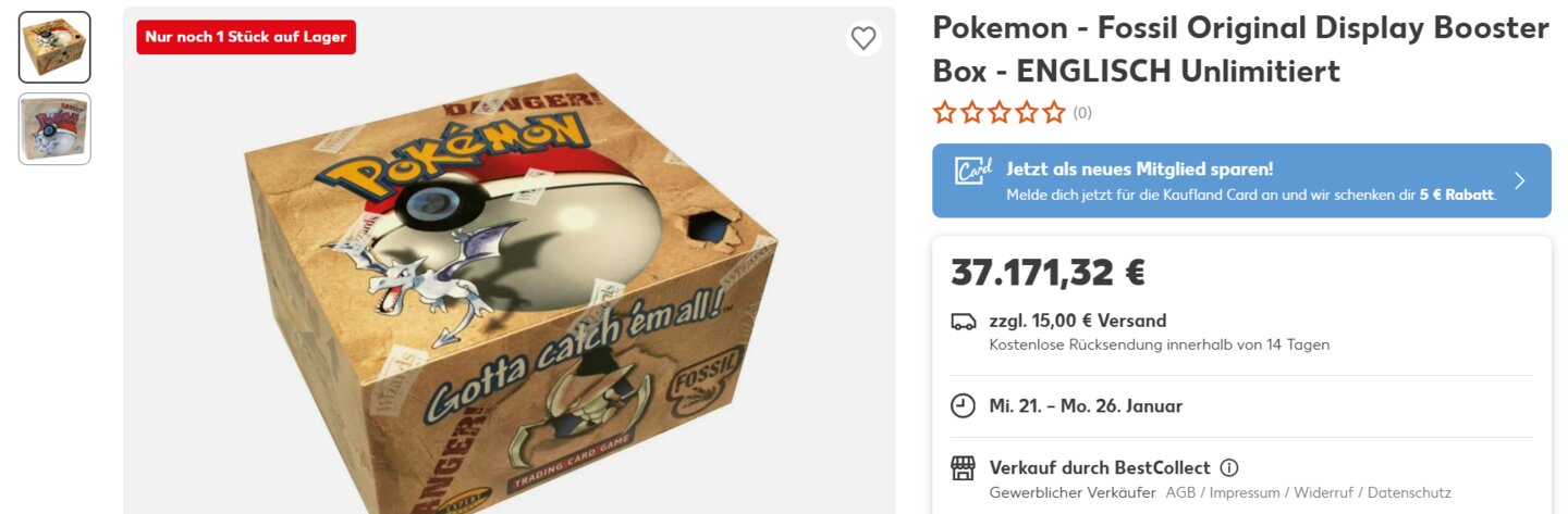Bei aktuellen Online-Angeboten für ein verschweißtes Fossil-Booster wird's übrigens noch absurder. Auf dem Online-Marktplatz von Kaufland (!) wird gerade eine Box für sage und schreibe 37.171,32 Euro angeboten (s. Bild oben). Ob die am Ende jemals wirklich verkauft wird, ist aber eine komplett andere Geschichte.