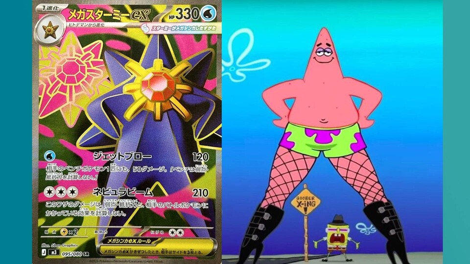 Ein paar User schreiben in den Kommentaren zwar, dass Mega-Starmie wohl eher eine Hommage an Ultraman oder Starman sein soll, das ändert aber nichts daran, dass die meisten wohl nur noch an den aufreizenden Patrick denken können, wenn sie die Karte sehen.