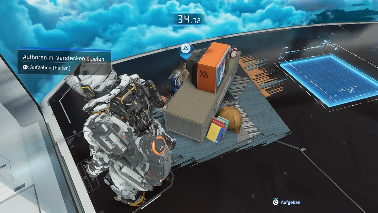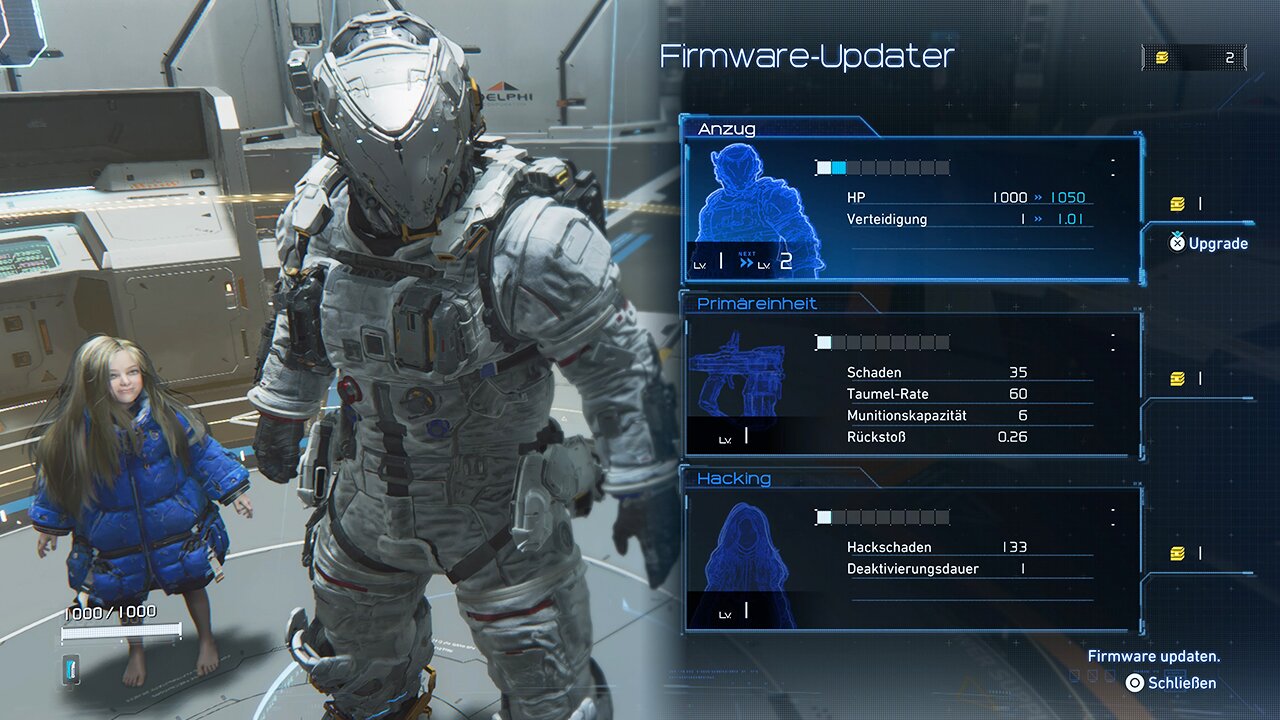 Sie löchert Hugh mit Fragen, freut sich tierisch über Erd-Gegenstände wie eine Rutsche oder einen Fernseher, die ich in der Spielwelt als Datenpakete finden und im Hub-Areal für sie drucken lassen können, und schenkt Hugh sogar selbstgemalte Bilder.