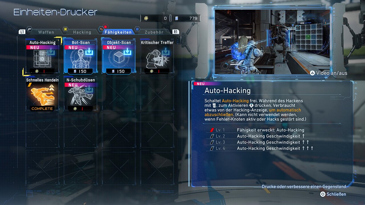 Heißt, sobald ich mit der Knarre auf einen Feind ziele, erscheint rechts auf dem Bildschirm ein Raster, durch das ich mit den Face-Buttons des Controllers navigiere, um ein grünes Feld zu erreichen. Dabei gilt es auch, Fallen zu umgehen oder weitere Knotenpunkte auf dem Weg zum Ziel zu passieren, die dann beispielsweise die Hacking-Dauer verlängern.