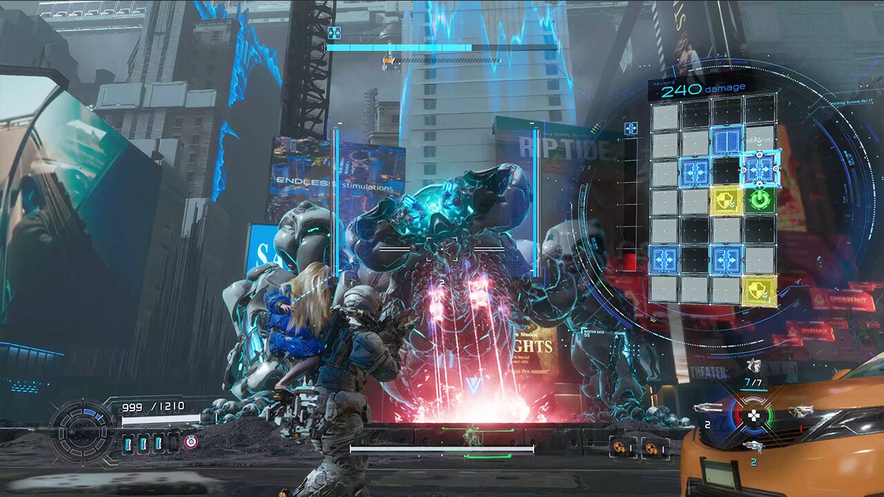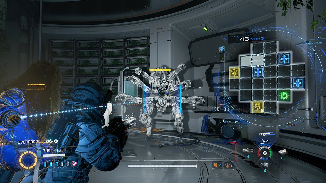 Das Highlight des Spiels ist nämlich sein ungewöhnliches Kampfsystem. Wie eingangs erwähnt, kombinieren wir hier Shooter und Hacking-Minispiel miteinander. Das passiert beides parallel und in Echtzeit.